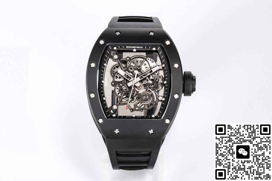 Richard Mille RM-055 BBR Factory V2 Black Ceramic Rubber Strap JF Replica, almost indistinguishable from the original, is made with advanced technology and exquisite workmanship, whether it is the hour markers on the dial, the shape of the hands, or the The buckle design reproduces every detail of the genuine watch in detail. It is guaranteed to be consistent with the genuine watch in appearance and function. Whether it is the well-known Rolex, Patek Philippe, Audemars Piguet, Omega, etc., there are top replica versions to choose from. In addition to the appearance, the internal movement of the top replica watch is also exquisite. They feature high-precision and reliable Swiss movements that ensure the accurate operation of the watch. More importantly, the movements of these replica watches are finely adjusted and run-in by professional craftsmen, ensuring the accuracy and stability of time.
